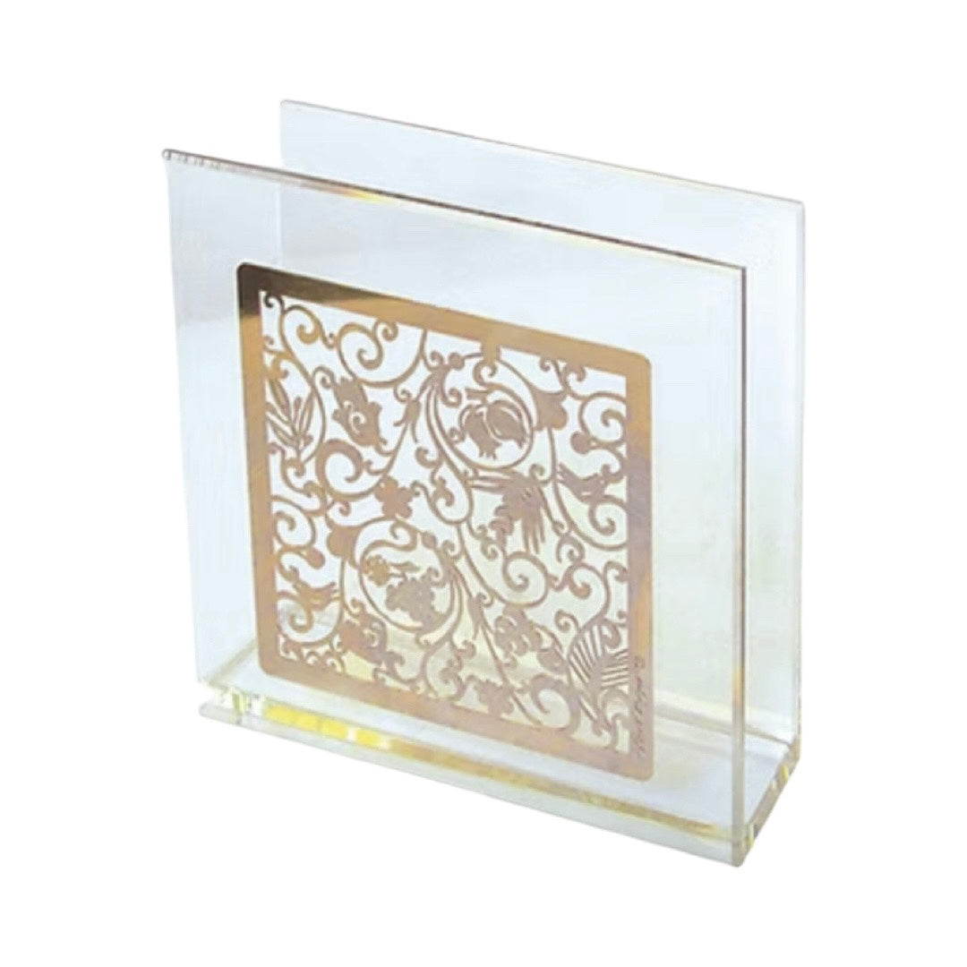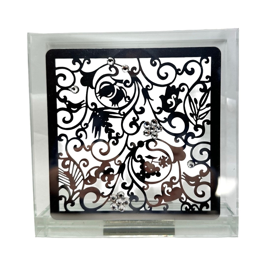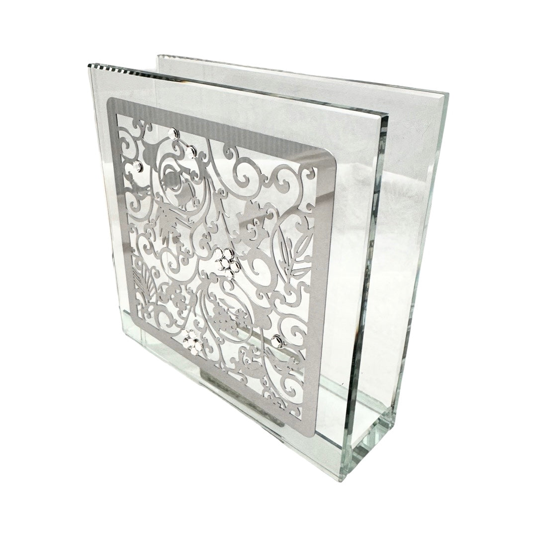 Crafted from crystal and stainless steel, this 5" x 5" napkin holder features the 7 species motif, making it an elegant centerpiece for any table. Expertly handmade in Israel by Anat Mayer.