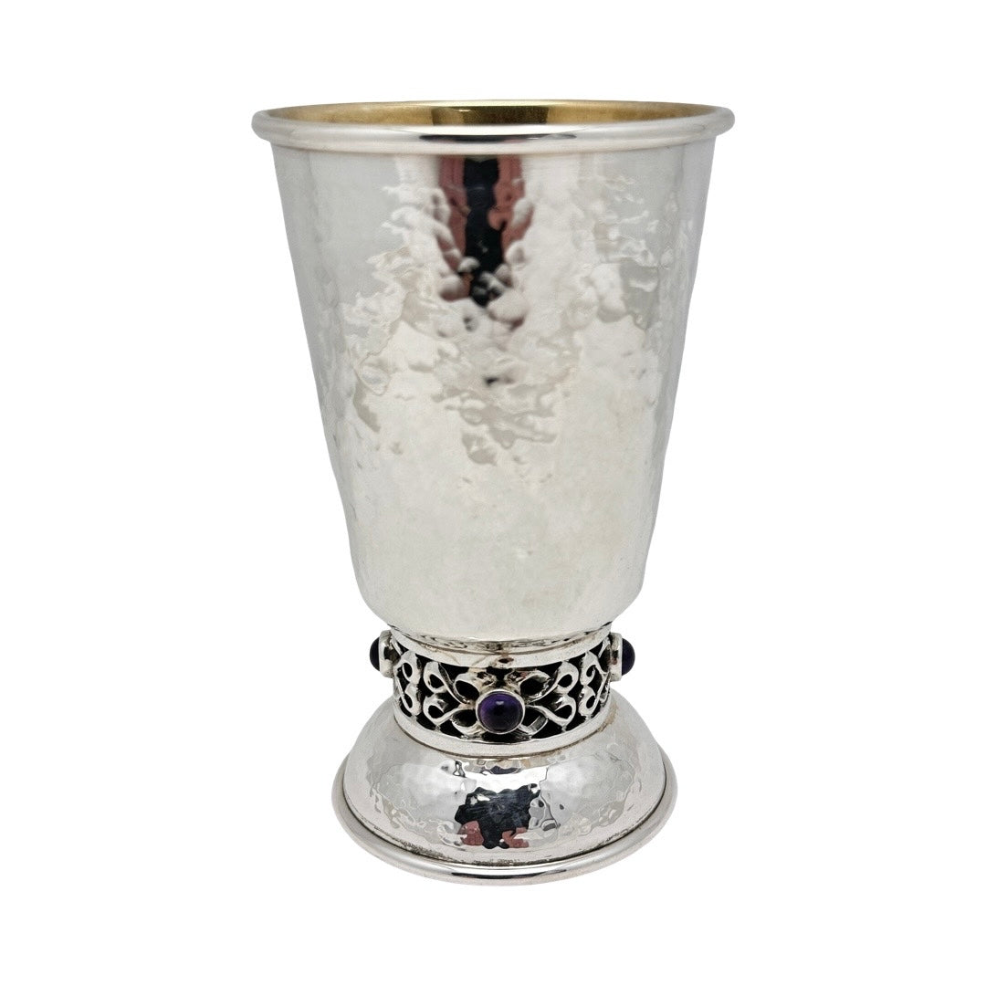 Discover the perfect blend of artistry and tradition with this remarkable hand-hammered kiddush cup by Nadav. Measuring 4.75 inches in height, this distinguished piece showcases four amethyst stones gracefully integrated into its casted stem base. The meticulous craftsmanship and elegant design make it an investment piece that commands attention and reverence—a meaningful addition to your collection that honors both spirituality and fine artisanal work.