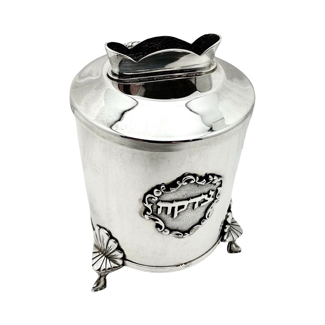 This exquisite Tzedakah box, measuring 5" in height and supported by three casted legs, is a finely crafted sterling silver item. Created in Israel by Dabbah Judaica, it enhances the meaningful act of giving tzedakah with its elegant design.