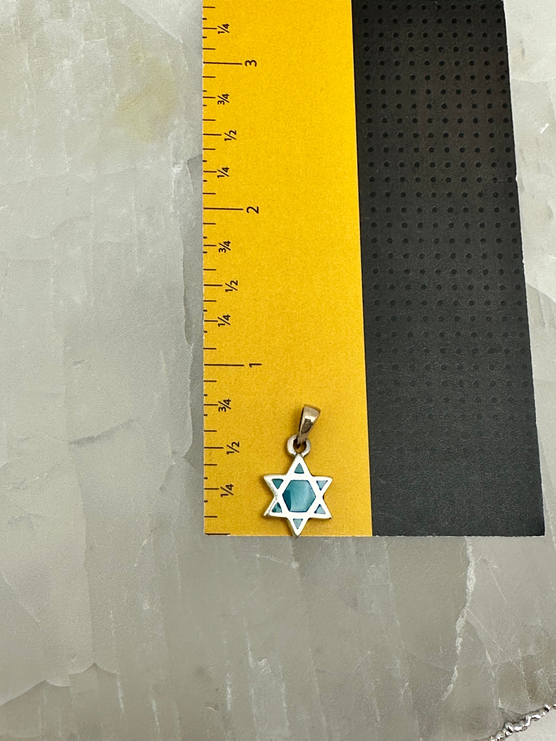 This delicate sterling silver Magen David stands 3/4" in height. It comes in either blue or turquoise enamel.