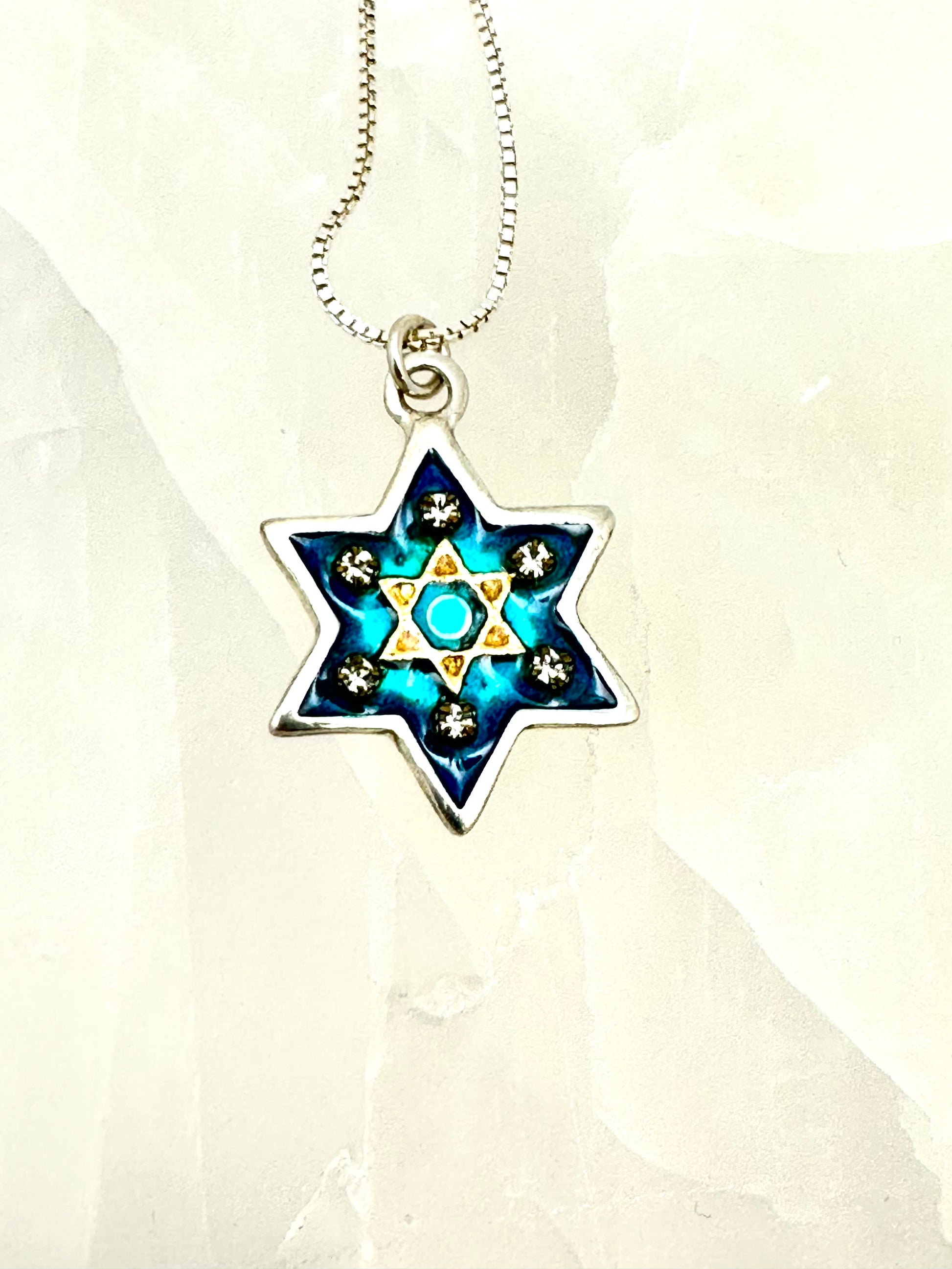 This striking Star of David pendant combines sterling silver with vibrant enamel detailing, creating a meaningful piece with refined craftsmanship. The 1-inch pendant hangs gracefully from an 18-inch sterling silver chain, offering versatile styling for both everyday wear and special occasions. Designed by Neta, this necklace balances traditional symbolism with contemporary elegance, making it a thoughtful addition to any collection.
