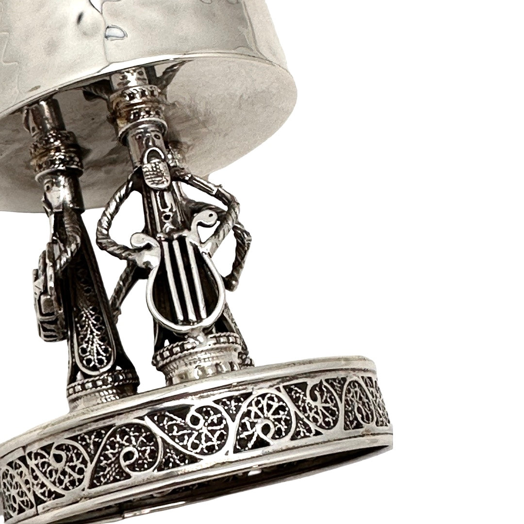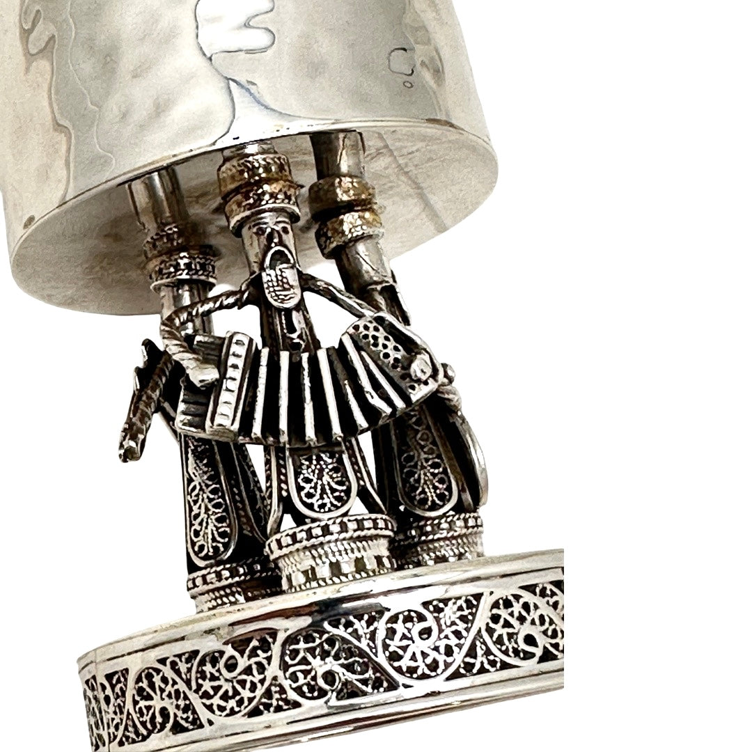 This filigree and hammered kiddush cup by Shoham features 3 musicians as the stem holding up the cup. It stands 5" tall and is the perfect gift for a collector or musician. Feels great in the hand with its substantial weight.
