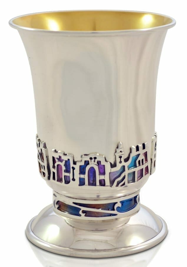 This sterling silver Kiddush cup merges refined craftsmanship with spiritual significance through its distinctive design. The vessel features a gracefully flared bowl balanced on a rounded pedestal, unified by an ornamental band of flowing enamel work. Vibrant Jerusalem imagery encircles the cup's body, celebrating the sacred city with meticulous detail. The interplay of polished silver and colorful enamel elevates the ceremonial experience, transforming each blessing into a moment of connection to tradition and place. Available with or without a matching tray.