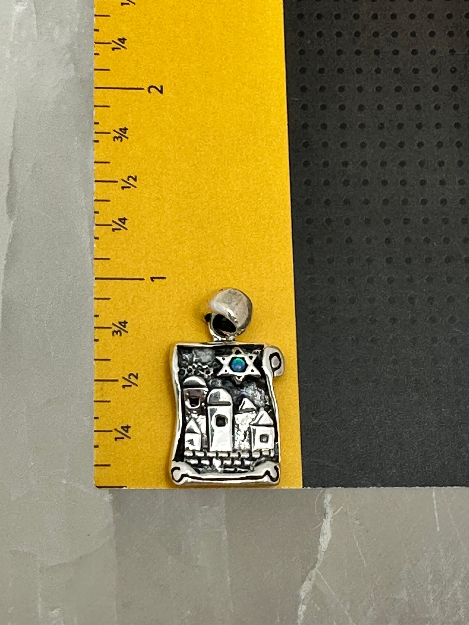 This sterling silver scroll features an elegant Jerusalem motif, accented with a delicate Magen David in one corner and a luminous opal stone. A refined piece that captures meaningful symbolism in timeless design.comes w an 18" chain measures 1" high