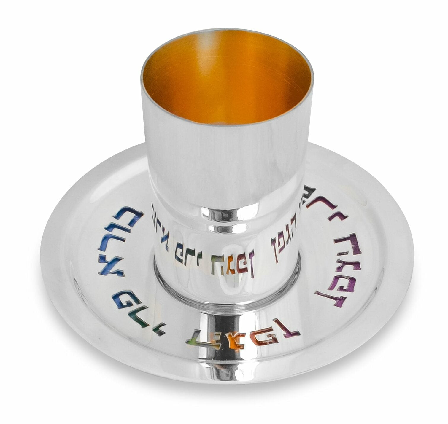 Elevate your Shabbat ritual with this stunning sterling silver Kiddush set, where timeless tradition meets contemporary artistry. Crafted from 925 sterling silver, this substantial piece features a captivating reflective design adorned with vibrant cold enamel accents and the meaningful Hebrew blessing "bore pri hagaffen." The weighty construction ensures durability and presence on your table, while the modern aesthetic brings fresh sophistication to your spiritual moments. Perfect for those who appreciate both heritage and design excellence.