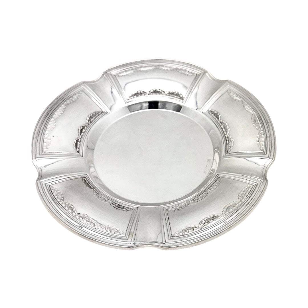A sterling silver kiddush cup and tray with diamond cut accents. The cup measures 4" tall and the scalloped tray is 7" across. Made in Israel.