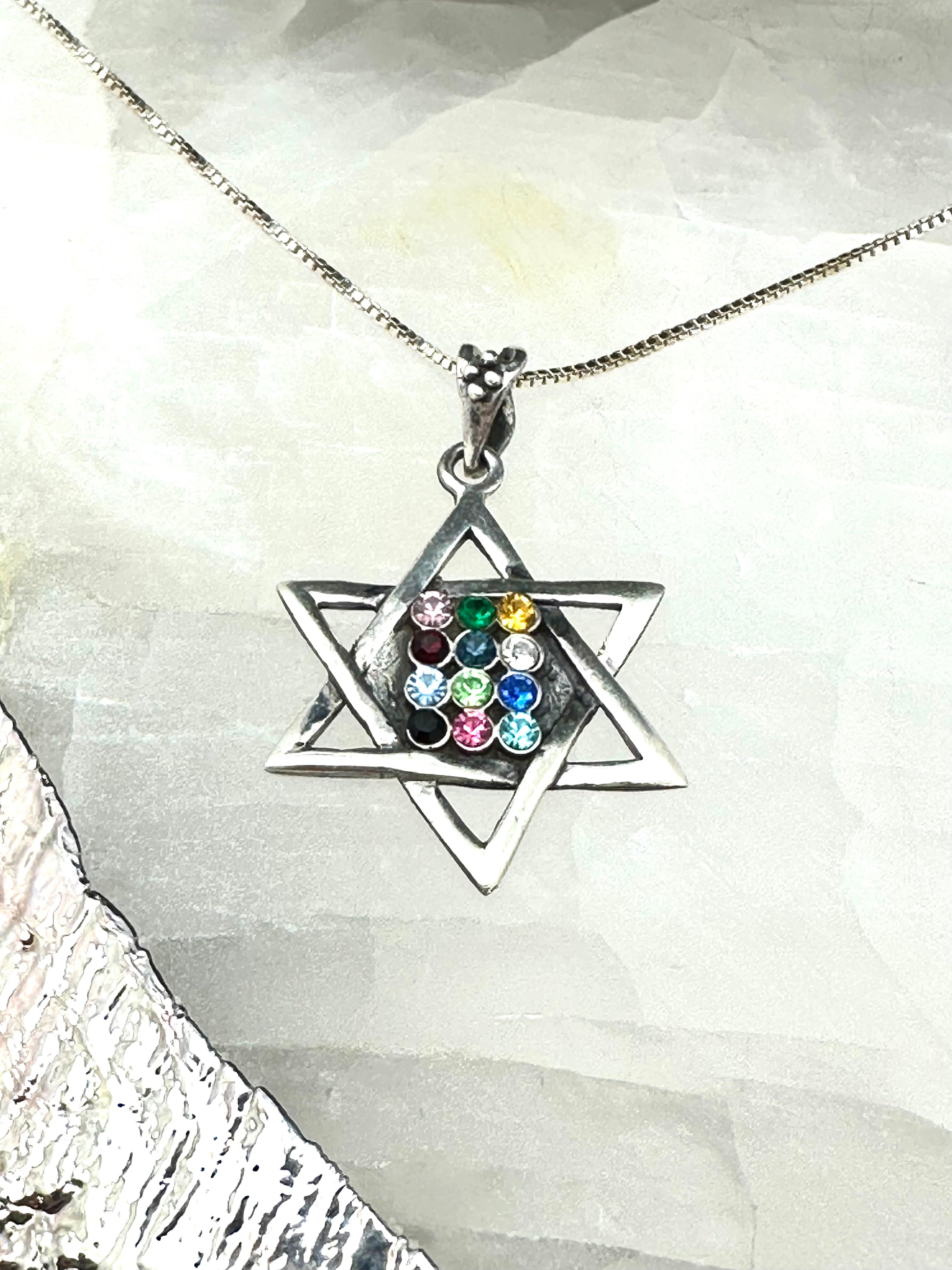 Handcrafted in Israel, this sterling silver Magen David pendant features an authentic hoshen design with vibrant gemstones at its center. Standing 1.5 inches tall, this piece combines traditional Jewish symbolism with expert craftsmanship and fine materials, making it a meaningful addition to any collection.