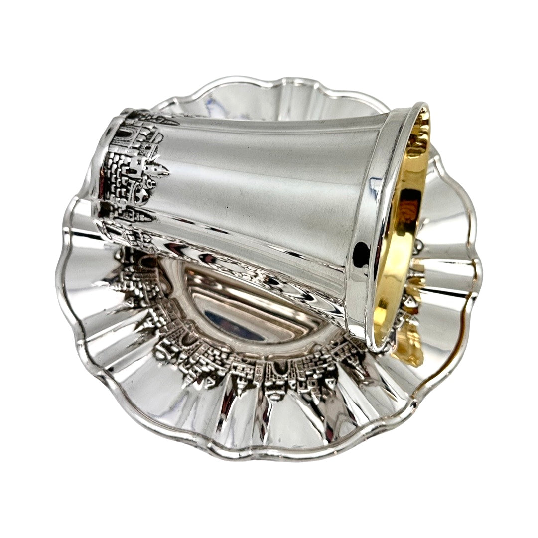 A casted Jerusalem skyline motif decorates this sterling silver kiddush cup and tray. The cup stands 3.75" tall and the tray is 5.5"in diameter. Made in Israel.
