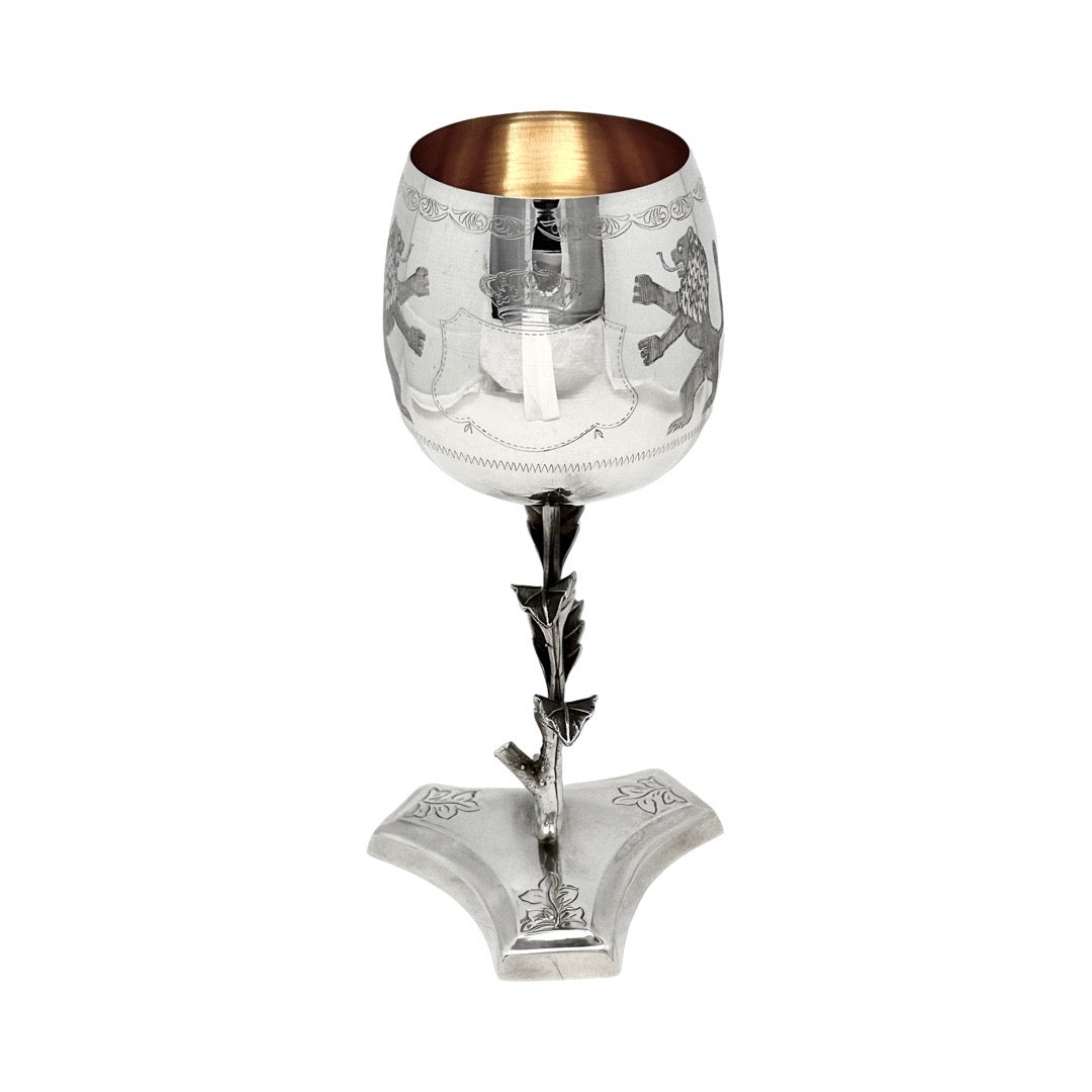 A sterling silver kiddush cup engraved with 2 lions holding a shield below a crown. Decorating the stem are 4 leaves on a casted branch. Associated with the Viznitz chasidim this cup replicates one used by the Viznitz Rebbe. It stands 6.75" tall.