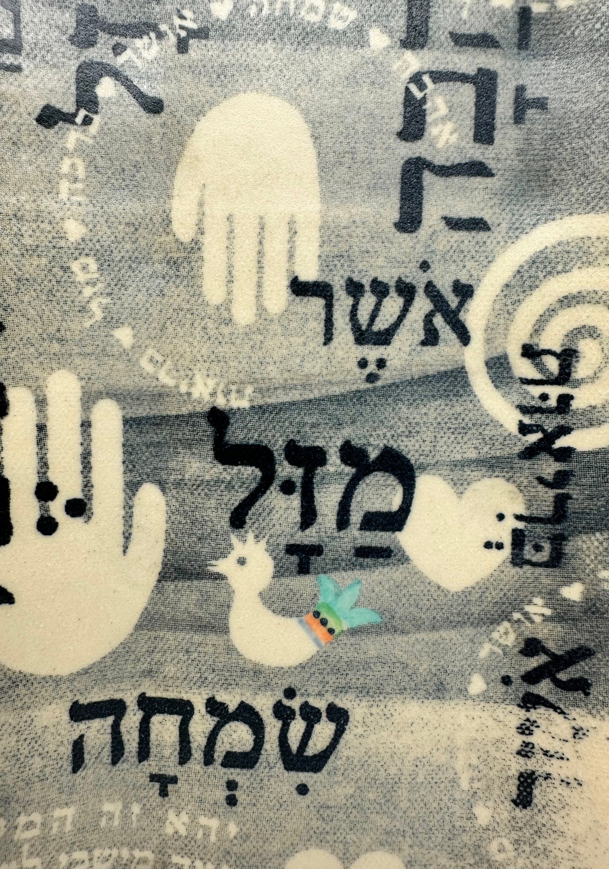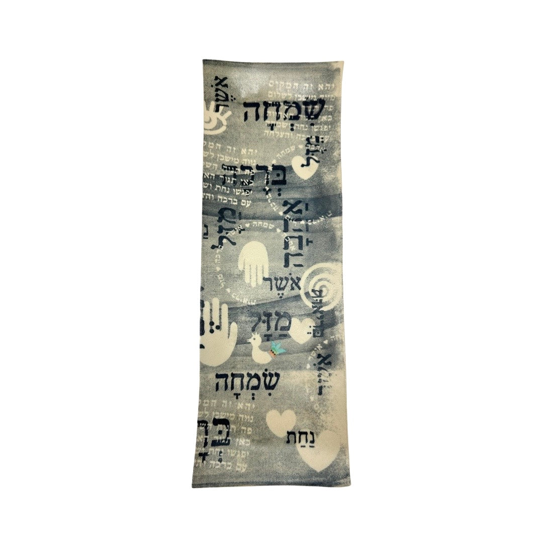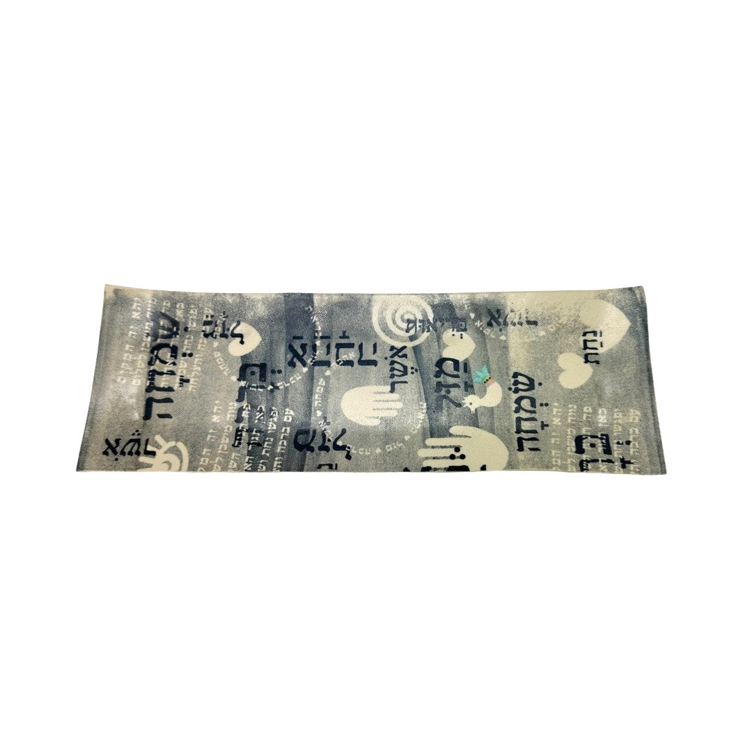 This handmade tray by Michal Ben Yosef measures 15" x 5".  Words 'mazal', 'simcha' and 'ahava' decorate this piece.